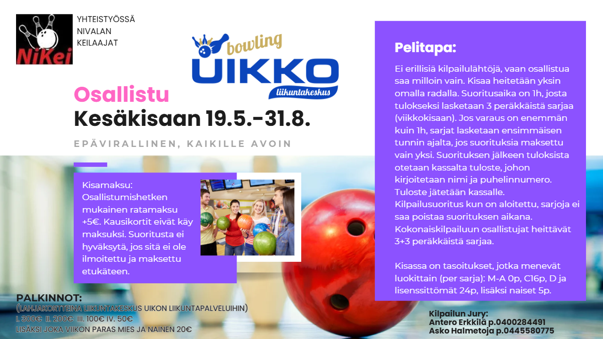Uikon kesäkisa (19.5.-31.8.) on kaikille avoin keilakisa, jossa ei ole erillisiä kilpailulähtöjä, vaan osallistua saa milloin vain!