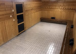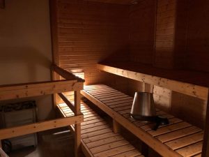 Sauna- ja suihkuosastot miehille ja naisille. Saunan lämmitys tapahtuu paikan päällä.